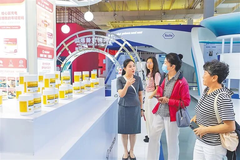 在博鳌乐城“永不落幕”国际创新药械展,销售专员在为游客介绍特许保健食品。海南日报全媒体记者 袁琛 摄