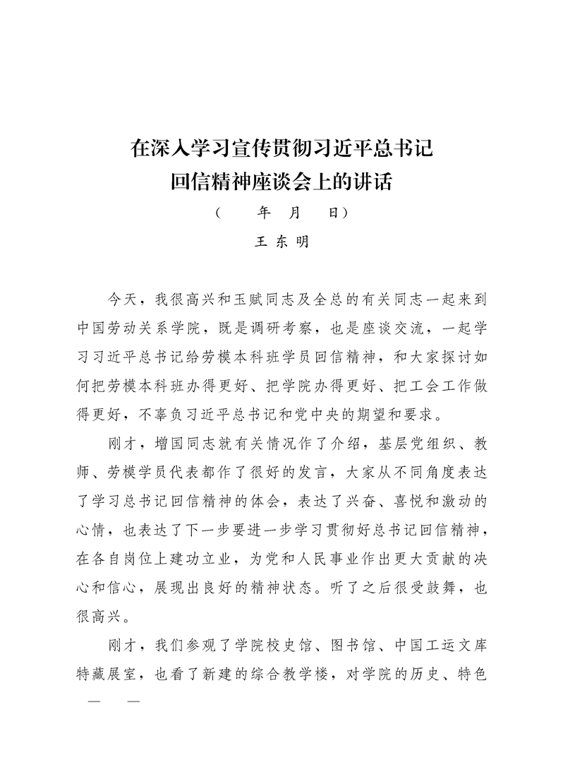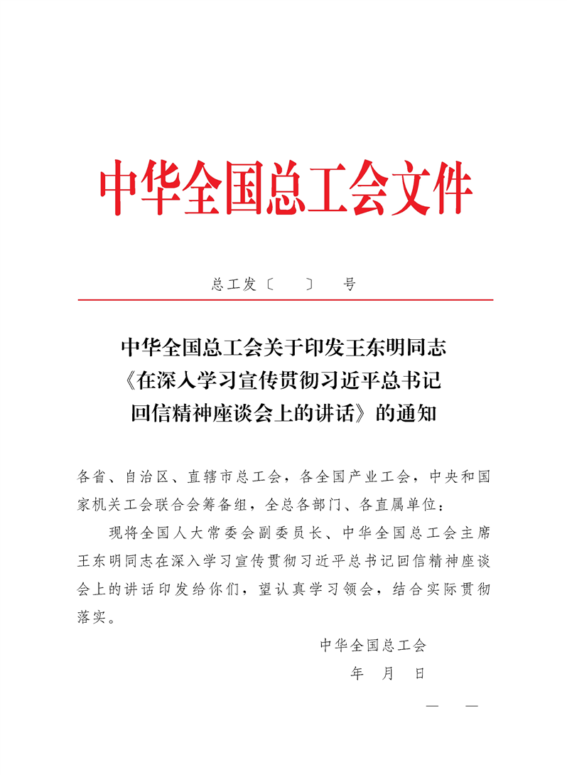 中华全国总工会关于印发王东明同志《在深入学习宣传贯彻习近平总书记回信精神座谈会上的讲话》的通知
