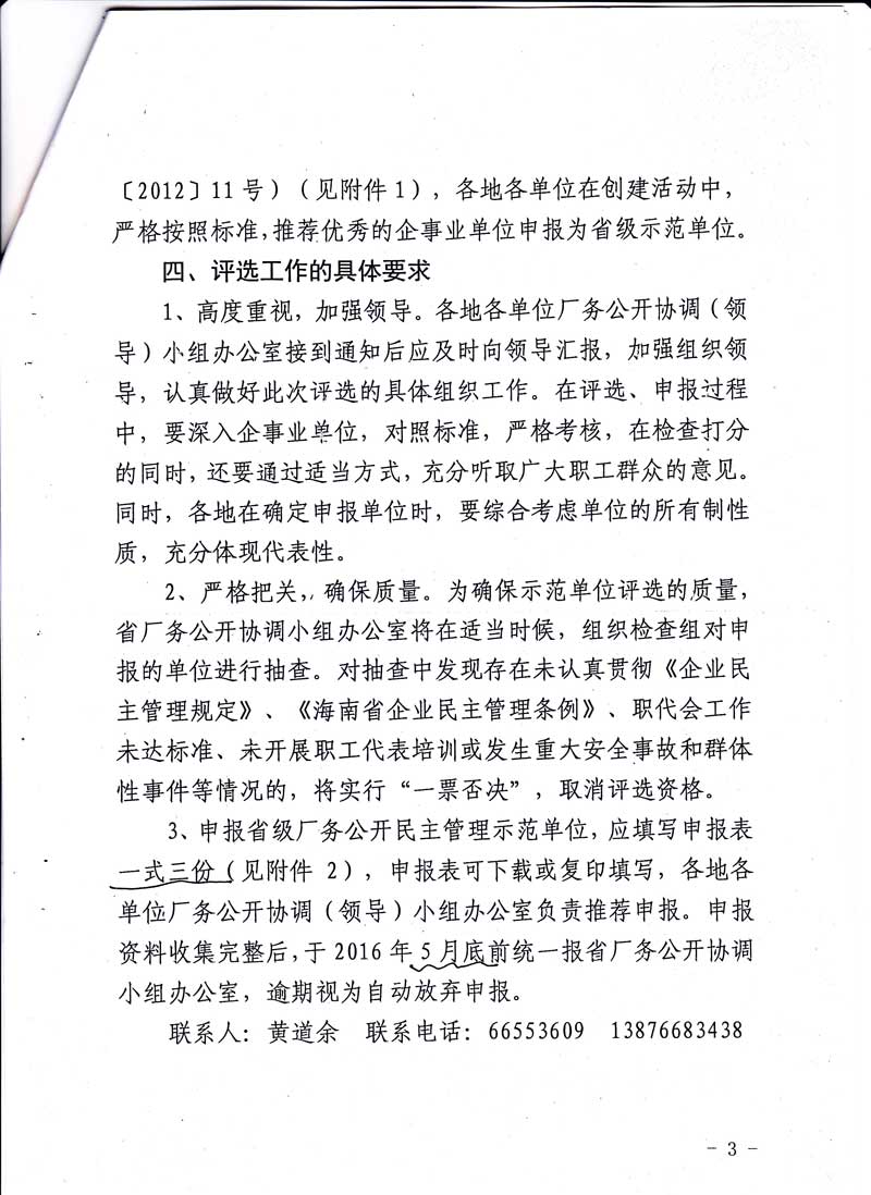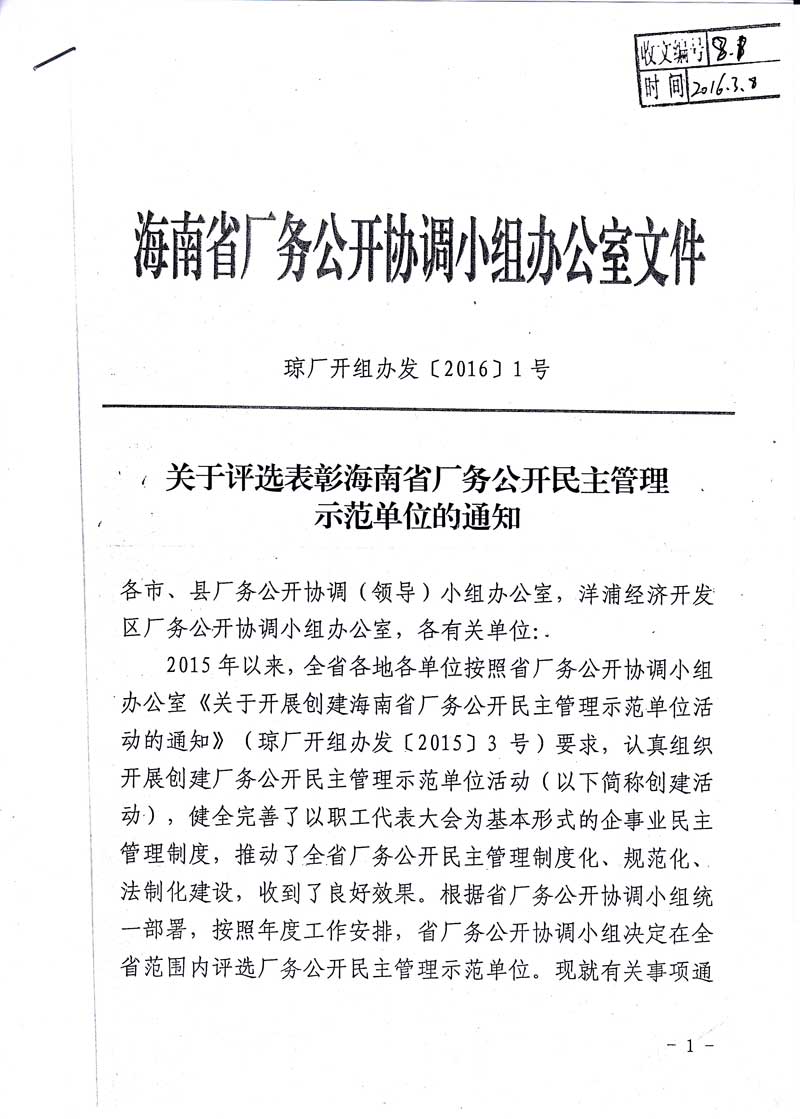 关于评选表彰海南省厂务公开民主管理示范单位的通知(琼厂开组办发〔2016〕1号)